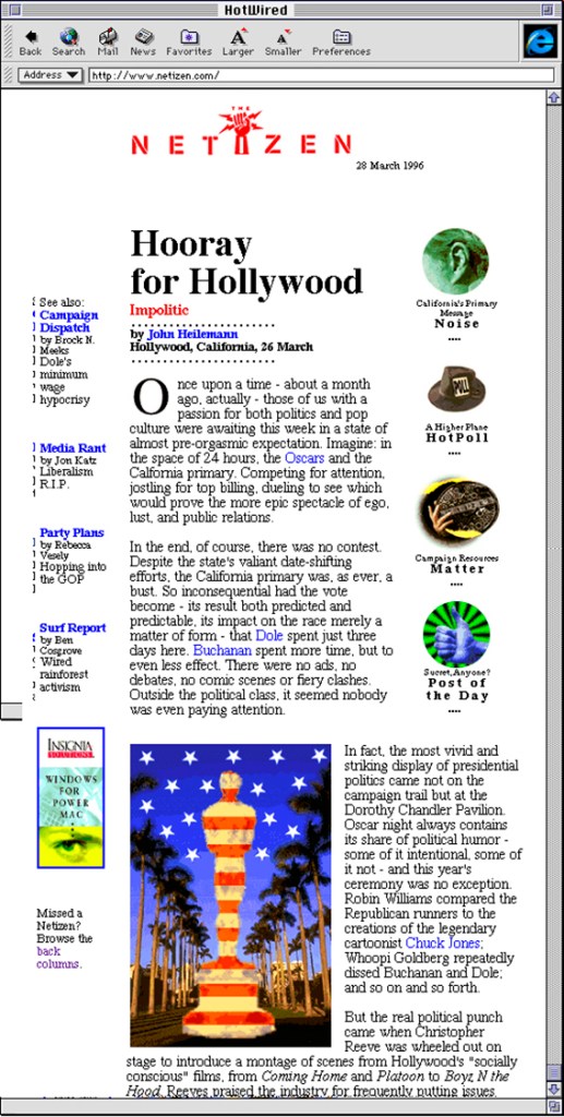 As the editorial and business potential of web media became more apparent, Wired poured the magazine’s profits into web R&D. WiredDigital created many websites, including WiredNews, The Netizen (a precursor to blogging), and Web Monkey – which taught anyone how to build their own website.